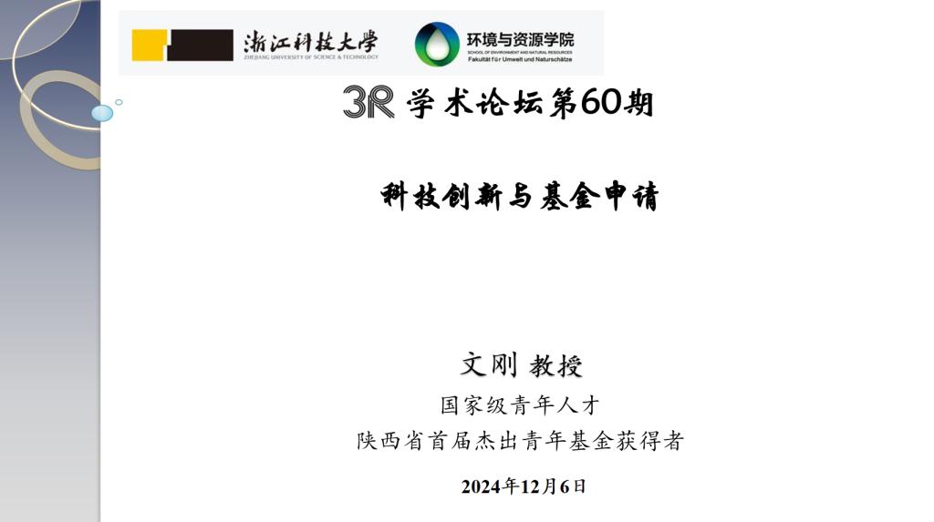 2024年12月6日下午,国家级青年人才项目入选者、陕西省首届杰出青年基金获得者、西安建筑科技大学环境与市政工程学院副院长文刚教授来访我院并作3R论坛第60期学术报告“科技创新与基金申请”。报告由学院郑兴教授主持,学院环境与工程系专业教师和在读硕士生等30余人参加了报告会。