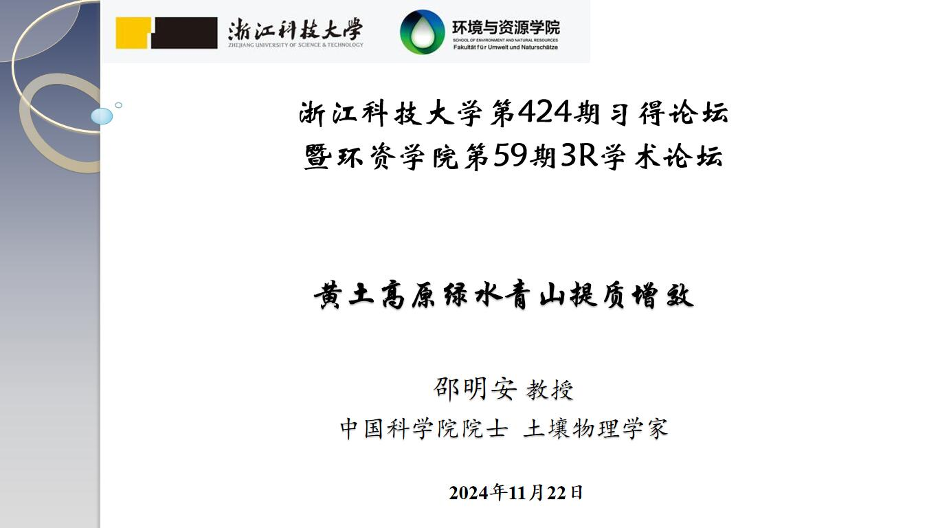 2024年11月22日,中国科学院院士、著名土壤物理学家、西北农林科技大学邵明安院士来访我院并作题为“黄土高原绿水青山提质增效”的学术报告,报告由学校党委副书记单胜道教授主持,报告由学校党委副书记单胜道教授主持,学院环境工程系专业教师和在读硕士研究生等四十余人参加了报告会。
