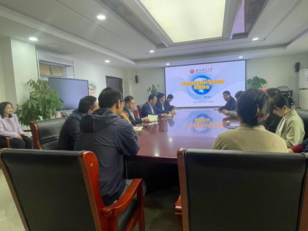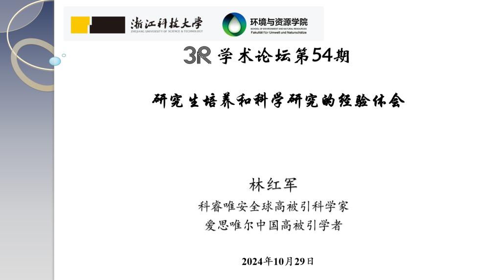 2024年10月29日上午,科睿唯安全球高被引科学家、爱思唯尔中国高被引学者、浙江师范大学林红军教授来访我院并作题为“研究生培养和科学研究的经验体会”的报告,报告由刘赫扬院长主持,学院环境工程系及轻化工程系教师等三十余人参加了报告会。