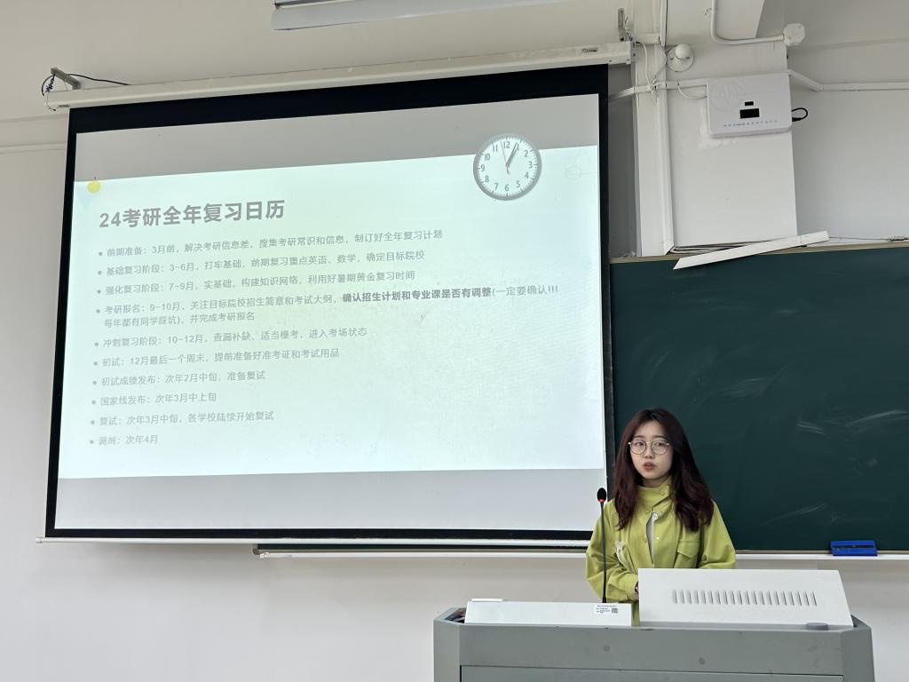 会上,杜策介绍了学院2023届考研相关情况,鼓励同学们尽早树立职业目标,做好人生规划,同时着重分析了当前就业形势,建议同学们根据自身实际选择好发展方向和学历提升路径。杜策表示,学院高度重视学风建设工作,会积极助力同学们学历提升,通过优化考研环境、加强考研交流培训、扩大考研信息渠道等系列举措,做好服务工作。