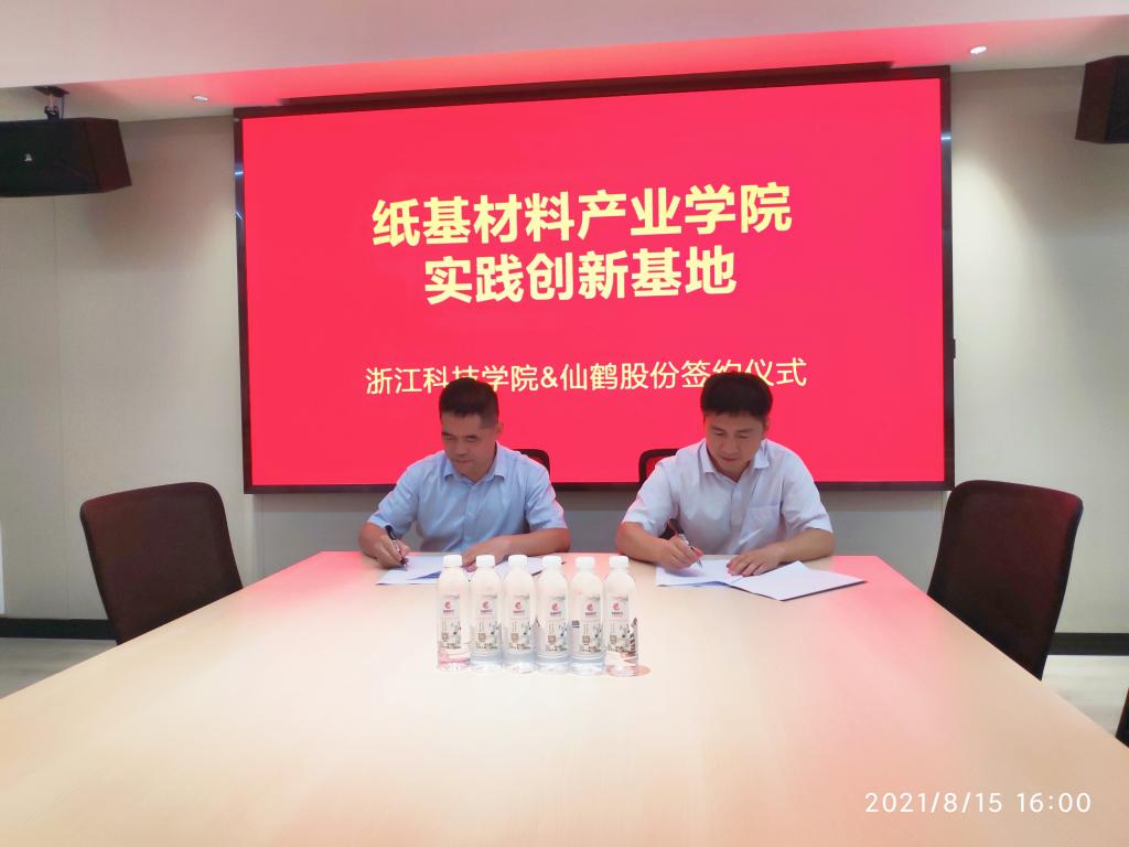 8月15日,纸基材料产业学院签约暨实践创新基地揭牌仪式在仙鹤股份高性能纸及纤维复合材料——浙江省产业创新服务综合体举行。仙鹤股份总经理助理张诚,总经办主任骆华英,夏王纸业副总经理骆志荣,总经办主任傅群英,浙江科技学院组织部副部长张学金,环资学院党政班子及轻化工程专业教师代表参加仪式。仪式由环资学院副院长胡志军主持。