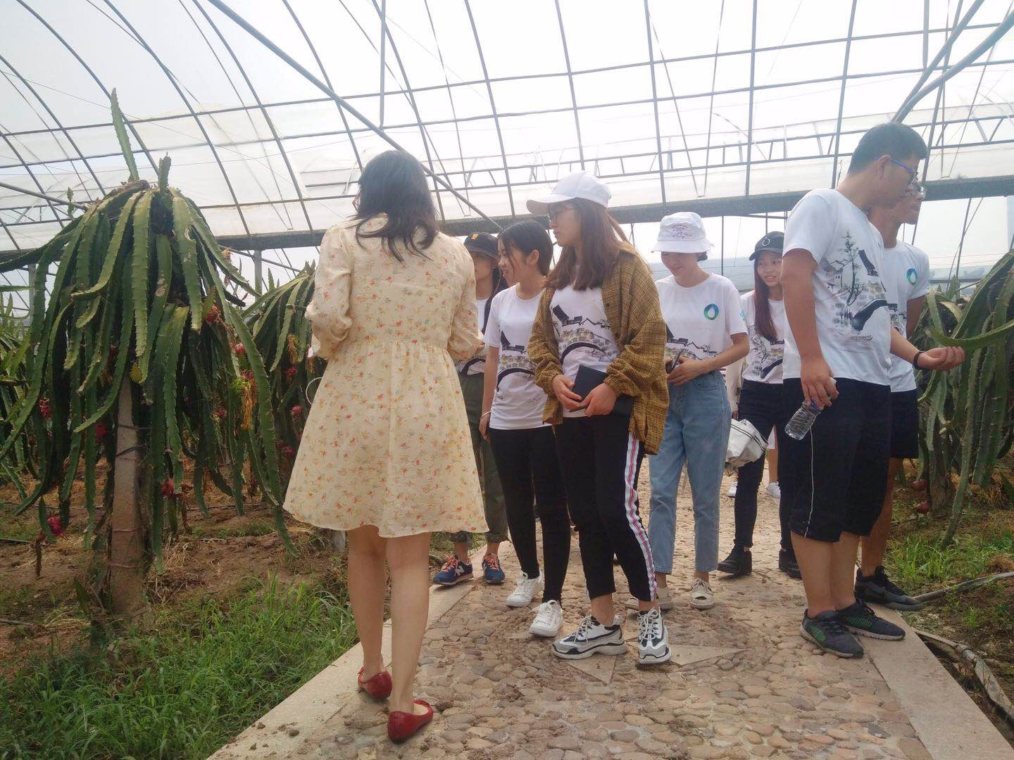 步入位于莲花镇的生态种植园,实践队员们不禁为其独特的经营模式所吸引。据悉,该种植园占地1000余亩,园内种植有黄金梨、南丰蜜桔、黄桃等二十多个品种近15万株果树,一年四季均有水果输出。同时,种植园还推出了特色旅游项目,游客可以亲自采摘水果,也可以进行乡村生活体验。为了切身感受其特点,负责人带领队员们进入了火龙果种植大棚进行细致讲解。实践队员们在浏览过程中注意到大棚顶层构造比较特别,负责人讲解说:“这是高智能化的大棚,能够通过系统调节温度、湿度、自动浇水。是现代农业的一部分。”
