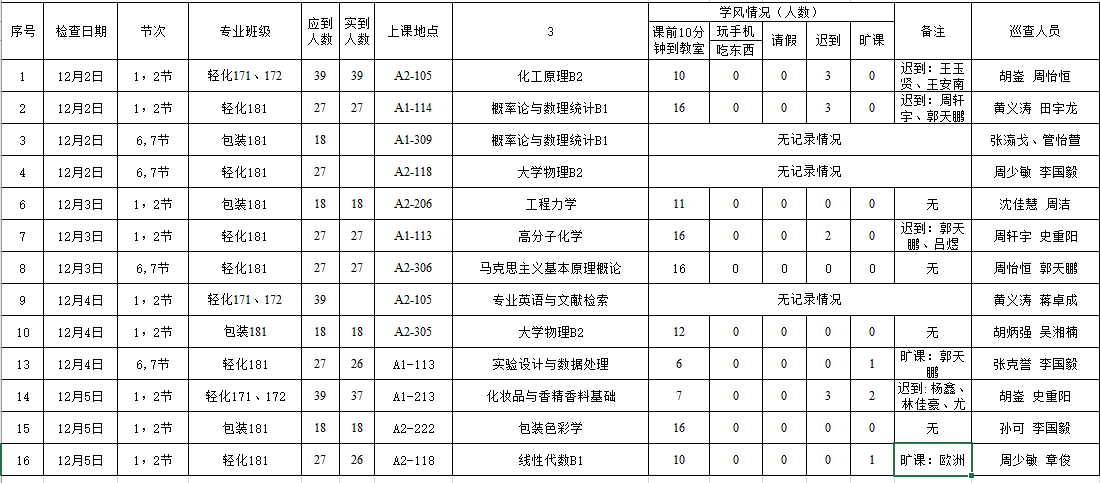 轻化181,实验设计与数据处理,翟睿老师,应到27人,7:50分到教室6人,旷课1人。学生听课较认真。