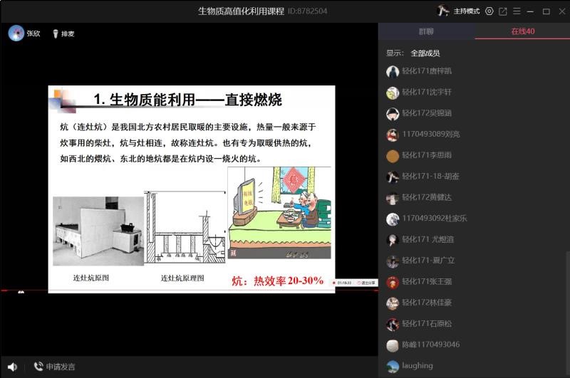 1、生物质高值化利用 1-16(1,2节) 张欣/郭大亮/张妍 轻化工程171,172。应到39人,实到38人,石原松、林佳豪、吴锦涵迟到,王玉贤未到。教师备课认真,能够主动找老教师听课,学习线上授课技巧。授课过程认真,学生互动好,线上授课过程出现互动连麦不稳定情况,授课教师课下尝试找原因。