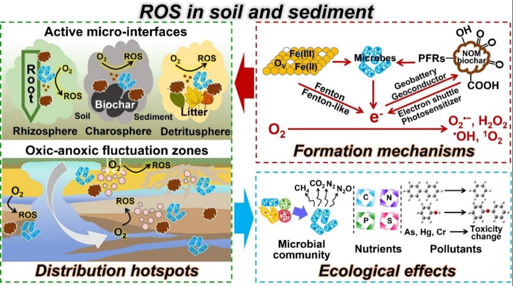 研究背景聚焦于传统活性氧(ROS)研究的局限性。既往综述多强调ROS的毒性和芬顿化学机制,缺乏对土壤/沉积物中ROS空间分布规律、多组分协同形成机制及生态效应的系统性整合。ROS(如超氧自由基O₂•⁻、过氧化氢H₂O₂、羟基自由基•OH和单线态氧¹O₂)作为环境中的关键活性组分,通过驱动碳氮循环、污染物转化和微生物群落演替深刻影响生态系统功能。然而,其分布异质性(如根际、炭际等微界面)和动态生成机制尚未明晰,制约了土壤碳封存与自然修复潜力的挖掘。