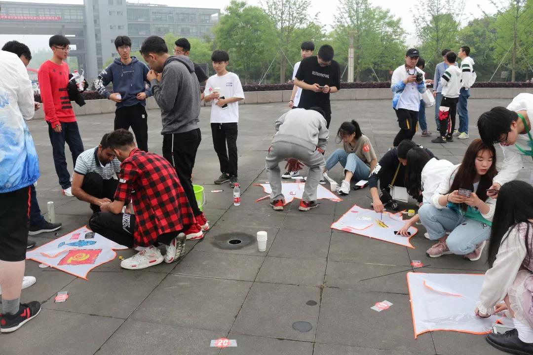 活动现场气氛热烈,同学们都积极参加游园游戏。纸杯传水、送鸡毛信、雷区取水、手脚并用、知识竞赛等小游戏同学们玩的不亦乐乎。同学们在游戏中学习团结,体验五四精神。天空下着小雨,纸笔勾勒春意。同学们怀着对新中国成立70周年的喜庆以及对五四精神的敬仰在风筝上绘出他们对祖国和党的美好愿望。
